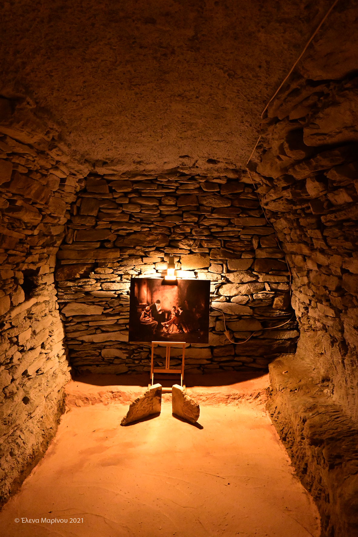 Ο χώρος δράσης τοποθετείται στην Τήνο και συγκεκριμένα στο χωριό Αρνάδος, όπου το ατμοσφαιρικό περιβάλλον του μεσαιωνικού κελαριού, συμβολικά επενδεδυμένο με τον θρύλο του κρυφού σχολειού, αποτέλεσε πηγή έμπνευσης για το ομώνυμο έργο του Τηνιακού Γύζη. Η ιδιαίτερη αρχιτεκτονική του οικισμού με τις μεσαιωνικές θολωτές καμάρες και τα καλντερίμια, αξιοποιείται στην εκθεσιακή παρουσίαση προς όφελος της βιωματικής, άμεσης και απτής εμπειρίας του θεατή. Συνθέτοντας μία ιστορικο-καλλιτεχνική διαδρομή στην οποία διασταυρώνονται η τέχνη και η πολιτική, στο εσωτερικό των καμαρών τοποθετούνται αναπαραγωγές έργων των: Α. Ακριθάκη, Δ. Αληθεινού, Γ. Γαΐτη, γλύπτη Θόδωρου, Β. Κανιάρη, Β. Κατράκη, Κ. Ξενάκη, Γ. Σίμωση, Α. Τάσσου, Κ. Τσόκλη και Γ. Ψυχοπαίδη. Παράλληλα, ένα πρωτότυπο mural μεγάλων διαστάσεων του Μ. Αναστασάκου τοποθετείται στην είσοδο του χωριού αποτελώντας τη σύγχρονη έκφραση αντίστασης στις δύσκολες σελίδες της σύγχρονής μας πραγματικότητας.
